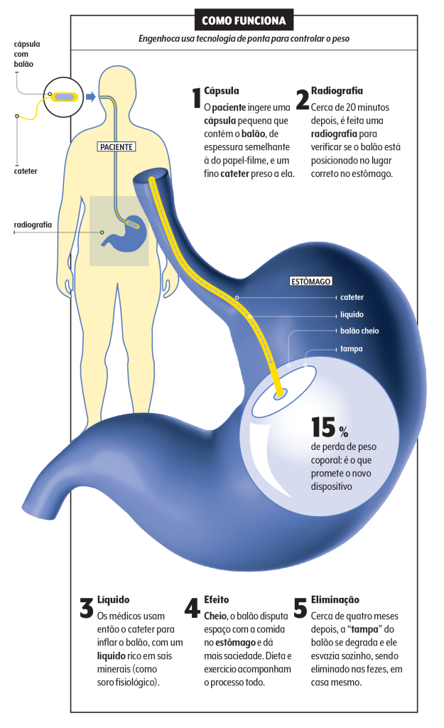 O balão gástrico já faz parte do arsenal terapêutico contra o excesso de peso. Funciona assim: o médico coloca o dispositivo para ocupar espaço no estômago e reduzir o lugar e a ingestão da comida.